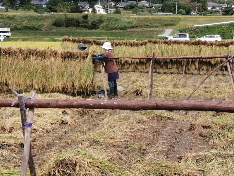 お米を乾燥させる「はざかけ」(このあたりでは「はぜかけ」といいます)は、昔ながらの丸太の棒と足を組んで行います。