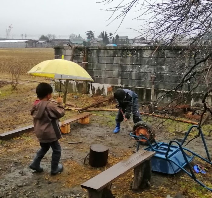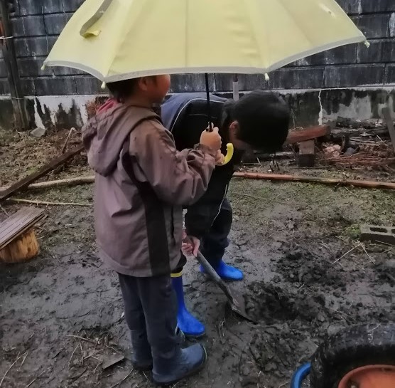 雨にもかかわらず、さっそくスコップを持って穴を掘りだすお兄ちゃんと、その兄に傘をさしかけるやさしい弟さん。