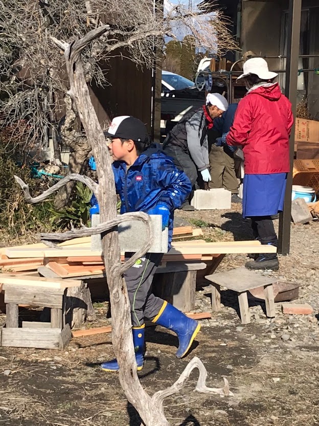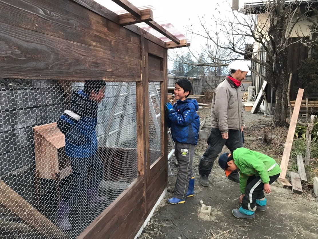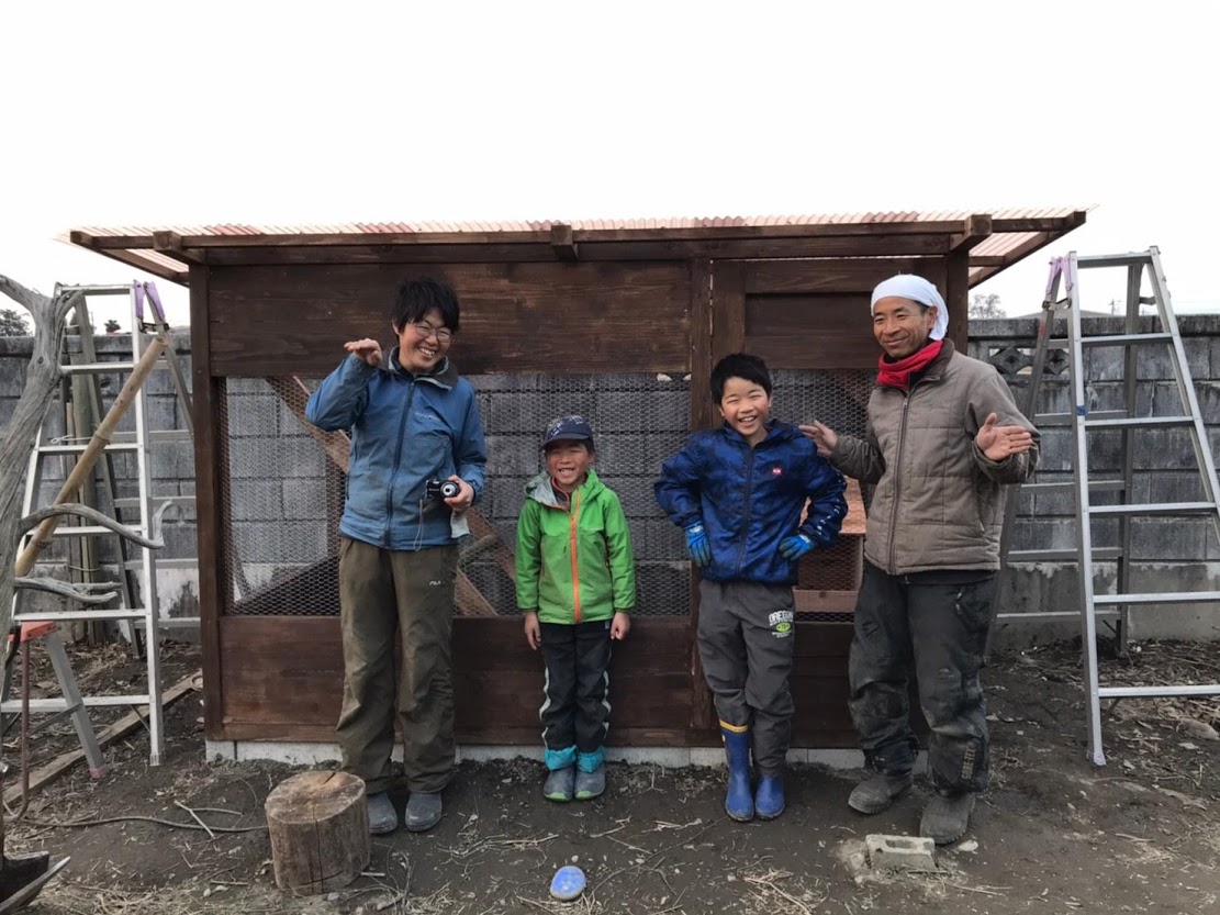 早春の一日、ご家族みんなで力を合わせて、にわとり小屋が完成しました!
