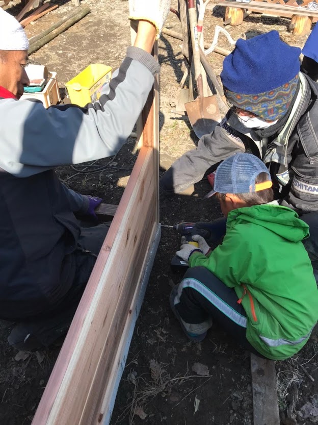 基礎ができたところで、小屋のパネルを組み立て。お子さんたちと一緒に電動ドライバを持ち、ビスを打ち込みました。