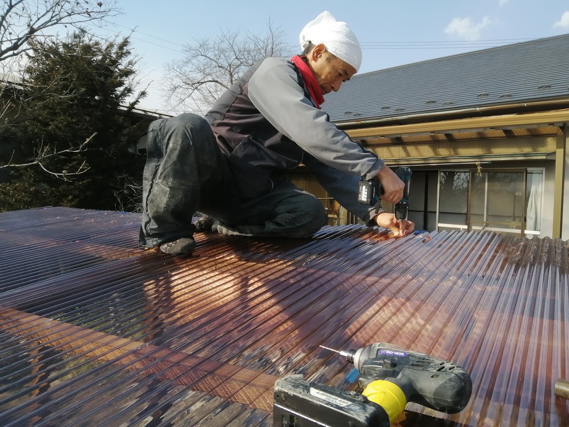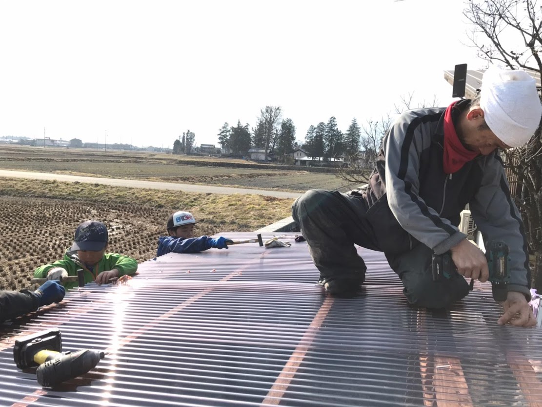 本体が組みあがったところで屋根に波板を釘で止めていきます。お父さんが屋根の上で大活躍!