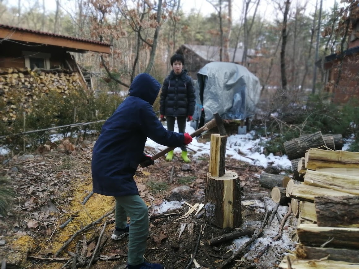 持ち帰った木は家族で薪割り。