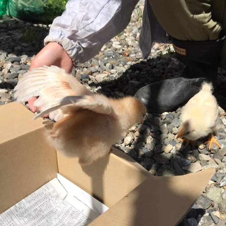 小屋の到着を待っていたのは、翼の羽根が生え始めた「あずさ」のヒヨコ2羽 🐤 🐤